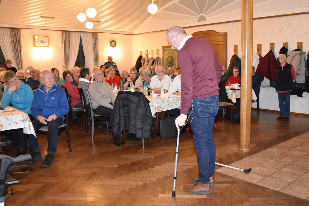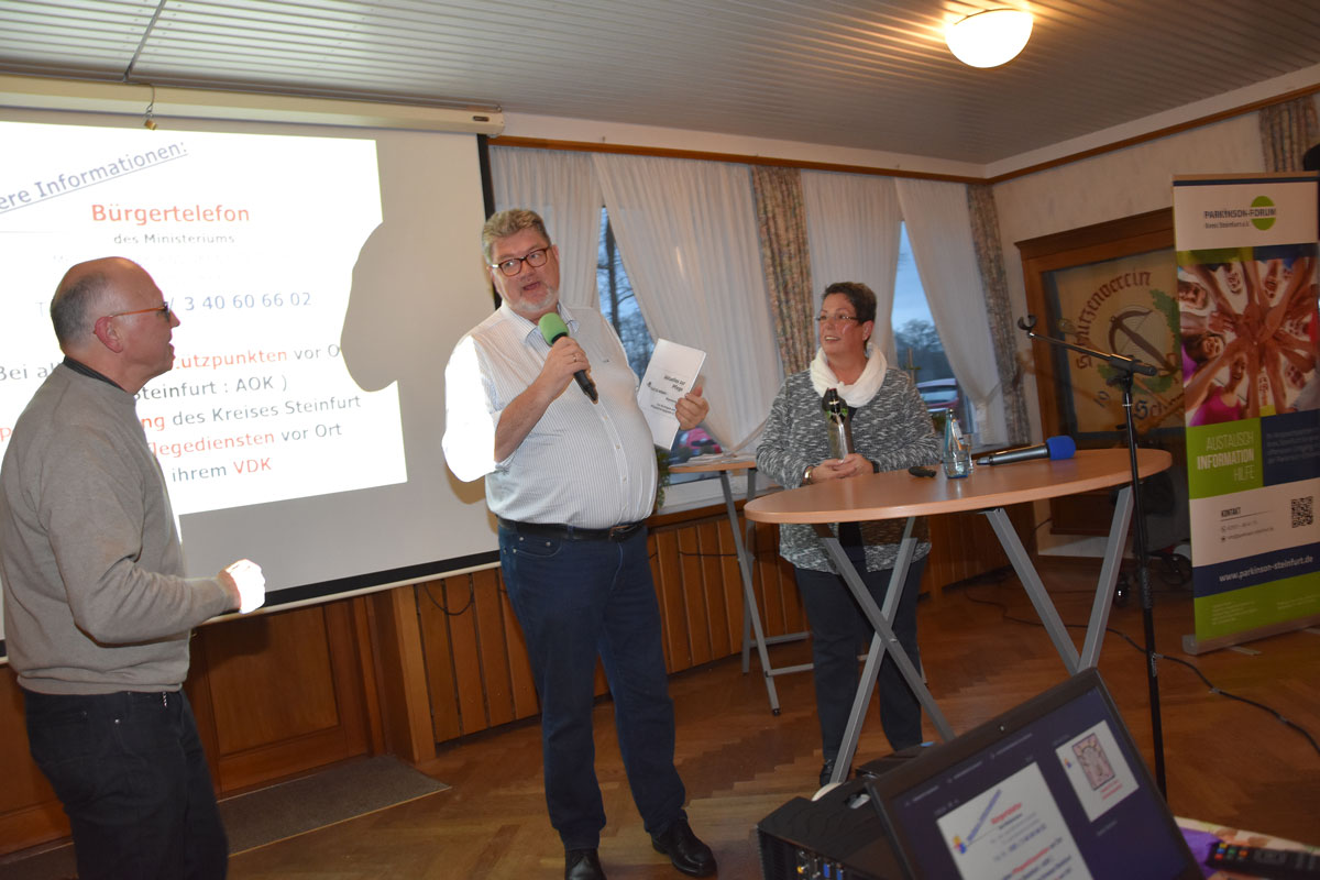 Vorsitzender Reiner Krauße stellte in seiner Begrüßung die neuen Mitglieder vor und informierte u.a. über den an jedem ersten Donnerstag im Monat stattfindenden „Gesprächskreis für Angehörige von Parkinson-Patienten“ unter der Leitung von Ergotherapeutin Heidrun Rüße. Er bedankte sich bei den beiden Technik-Verantwortlichen Manfred Stauvermann und Konrad Göcken sowie bei Hagen Libeau für die Erstellung der Power-Point-Präsentationen und bei Angelika Relt für die Leitung des monatlichen Parkinson-Stammtisches in Laer.