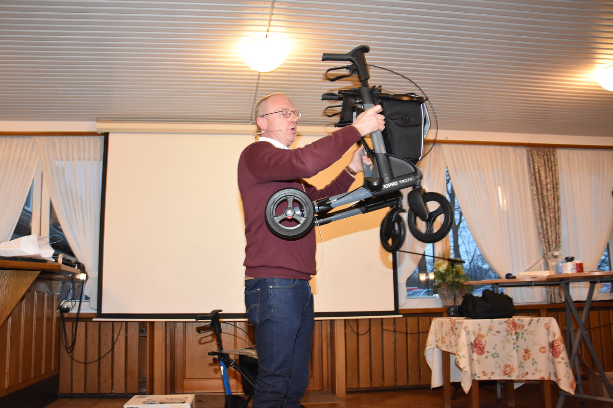 Anschließend stellte Jürgen Perick vom Sanitätshaus Perick verschiedene Hilfsmittel vor: u.a. einen speziellen Parkinson-Rollator, der das sogenannte Freezing“ überwinden hilft und weitere Rollatoren mit ihren Vor- und Nachteilen. Spezielle Gehstöcke können ebenfalls beim „Freezing“ erfolgreich eingesetzt werden. Hilfreich sind auch Greifhilfen wenn z.B. etwas auf den Boden gefallen ist. Ein Transfer-Brett erleichtert das Zubettgehen, während ein Positionier-Kissen eine Schräglage und ein Verrutschen beim Sitzen verhindert. Der sogenannte „Parkinson-Rucksack“ richtet bei Bedarf den sich nach vorne neigenden Oberkörper wieder auf.