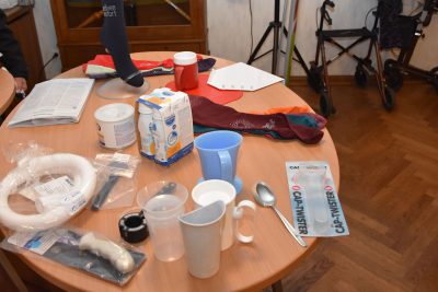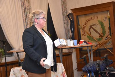 Hilfsmittel, die den Alltag für Parkinsonpatienten erleichtern, zeigte Karen Krümpel, ebenfalls vom Sanitätshaus Perick. Eine Tasse mit beweglichem Henkel und einem Deckel verhindert das Verschütten beim Trinken und Transportieren, da die Tasse immer senkrecht bleibt. Ein Silikon-Aufsatz für Tremor-Patienten auf der Laffe des Esslöffels und ein spezieller Becher mit Aussparung an einer Seite für Patienten mit Schluckstörungen erleichtern das Essen und Trinken. Für Patienten mit Schwindel beim Aufstehen gibt es Kompressionsstrümpfe, die durch die unterschiedlichen Farben und z.B. mit Strass verziert, nicht mehr als solche wahrgenommen werden.
