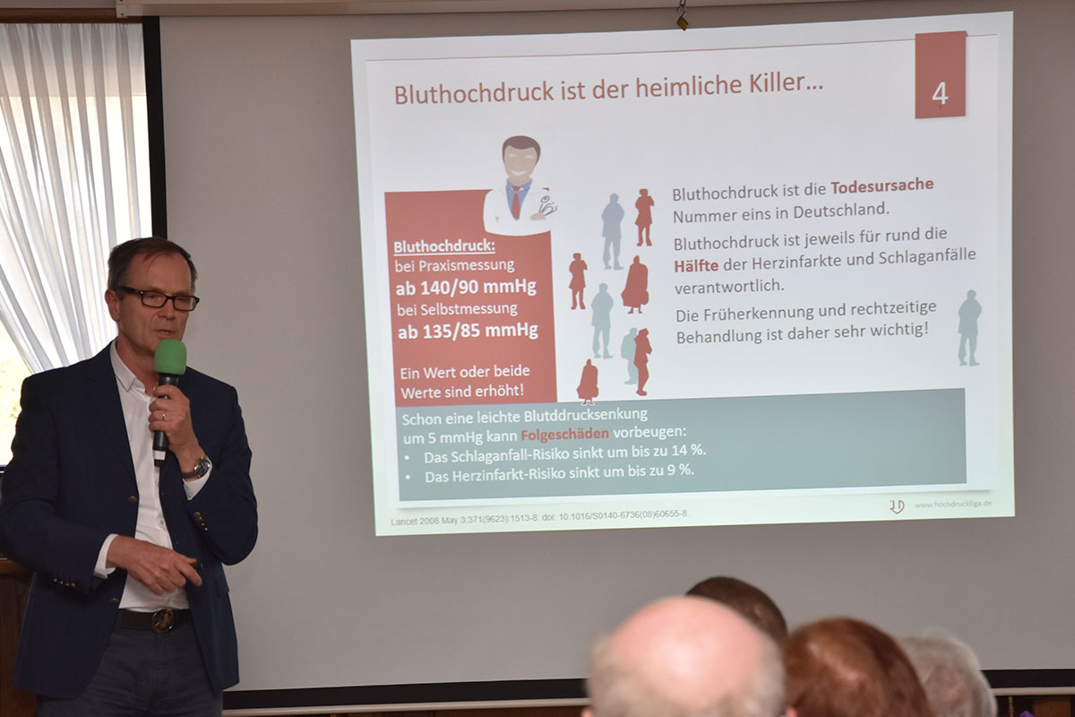 Ursachen der Erkrankung sind meistens eine erbliche Anlage, Übergewicht oder auch Alkohol, seltener Nieren- oder Gefäßerkrankungen, hormonelle Erkrankungen, Medikamente oder auch Schlafstörungen. Eine Änderung des Lebensstils kann bei leicht erhöhtem Blutdruck so viel bewirken wie zwei Medikamente zusammen: Eine Beschränkung der Kochsalzzufuhr, Gewichtsabnahme, regelmäßige sportliche Aktivität, Einschränkung des Alkoholkonsums, Verzicht auf Rauchen und eine gesunde Ernährung mit viel Obst und Gemüse, wenig Fleisch, Fett und Zucker. Ein Zuviel an Salz kann durch Kräuter und Gewürze ersetzt werden. Abschließend ging Dr. Fechtrup ausführlich auf die zahlreichen Fragen der Anwesenden ein.