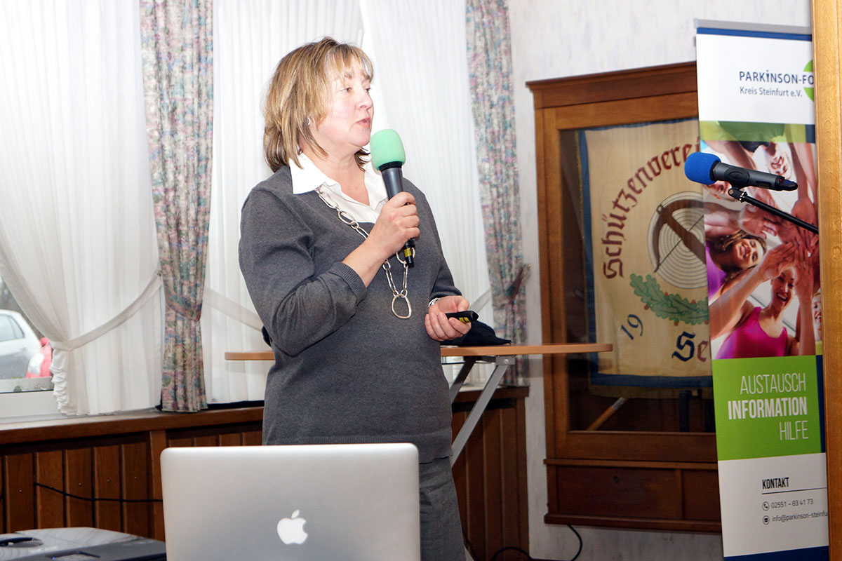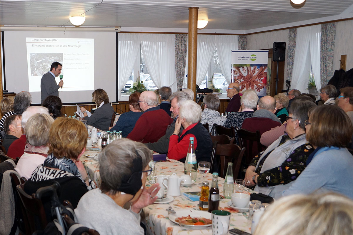 Ausführlich berichtete Dr. Pérez-González, Chefarzt der Klinik für Neurologie Christophorus-Kliniken Dülmen, in seinem Vortrag über die Möglichkeiten der Botox-Behandlung bei Parkinson. So kann über eine Injektion des Botolinumtoxins (bekannt als Botox) in die Muskulatur eine Spastik, hierbei handelt es sich um eine krankhaft erhöhte Muskelanspannung, gelöst und eine Schmerzlinderung beim Patienten erreicht werden. Der erfahrene Neurologe stellte heraus, das die im vierteljährlichen Rhythmus zu wiederholende Spritzentherapie z. B. bei quälendem Speichelfluss, übermäßigem Schwitzen, urologischen Problemen oder Kontrakturen angewendet werden kann, was für die Betroffenen eine wesentliche Steigerung der Lebensqualität bedeutet.