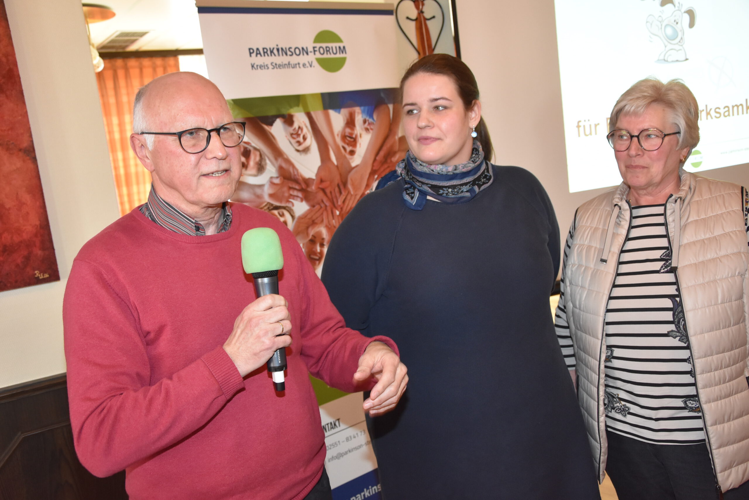 „Die Krankheit ist nicht heilbar. Aber man kann viel tun, um den Verlauf zu verlangsamen“, so Heidrun Rüße, Dipl.-Ergotherapeutin aus Steinfurt, in ihrem Vortrag über Behandlungsmöglichkeiten durch Ergotherapie bei Parkinson. „Ergotherapie ist ein vielfältiges Heilmittel, das dem Kranken helfen soll, so lange wie möglich seinen Alltag zu bewältigen.“ Rüße ging, assistiert von Samantha Schulz, zunächst auf die Situation ein, wenn Parkinson diagnostiziert wird. „Was nun? Mit Hausarzt und behandelndem Neurologen aufkommende Fragen klären.“ Sie erläuterte medikamentöse Therapien sowie ihre Begleiterscheinungen und beschrieb dann den Einsatz von Therapie- und Sportgeräten beziehungsweise die Biomechanische Stimulation (BMS), Feinmotorik- oder Hirnleistungstraining. „Wichtig ist auch die soziale Ansprache und die Beratung und Begleitung der Angehörigen.“Miteinander zu reden tut gut war quasi die Überschrift, als sie den von ihr seit fünf Jahren betreuten Angehörigen-Gesprächskreis vorstellte und einige ihrer Stimmen vorlas wie: „Wir sind nicht allein mit unserer Situation“, „Wir suchen gemeinsam nach Lösungen“ oder „Hier kann man sich austauschen“, aber auch „Wir lachen zusammen“.
