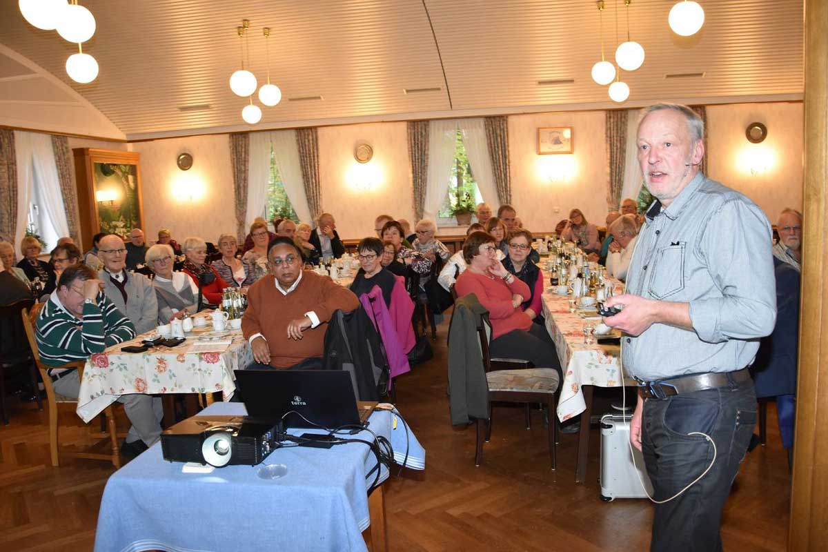 So vergleicht er die Lebenserwartung der Menschen in verschiedenen Regionen der Welt, erläutert Alterungsprozesse und geht auf die Entwicklung von Organen im Alter sowie auf die Veränderung der Hormone ein. „Altern hat auch etwas mit Stimmung zu tun“, so Schubert. Im Zusammenhang mit der großen Menge an Medikamenten, die seine Zuhörer teilweise einnehmen müssen, rät er ihnen dringend: „Egal zu welchem Arzt Sie gehen, nehmen Sie immer Ihren Medikamentenplan mit.“