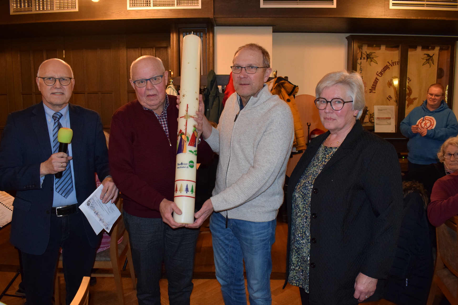 Reiner Krauße und Dorothea Stauvermann überreichten eine große Kerze für die Krieger-Gedächtniskapelle in Borghorst an Karl-Heinz Stöhler und Heribert Schräder. Hintergrund: Der ehemalige stellvertretende Bürgermeister Heinz Hille war Schirmherr der Kapelle. Ihm lag sie ganz besonders am Herzen. „Zu Ehren von Heinz Hille und seiner Frau Gisela, die beide leider bereits verstorben sind, zünden wir an jedem 24. Dezember um Punkt 12 Uhr eine Kerze in der Krieger-Gedächtniskapelle an“, erläuterte Krauße. „Dies hier ist die größte Kerze, die wir dort je aufstellten.“