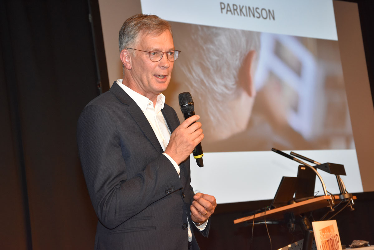 Nach der Begrüßung der insgesamt über 330 Teilnehmer durch Dr. Kusch stellte Dr. rer. medic. Hubertus Lohmann stellte das Parkinsonnetzwerk Münsterland+ vor. Hierin sind u.a. Ärzte, Therapeuten, Pharmazeuten und KIiniken vernetzt um sich über Krankheiten auszutauschen, Fortbildungen zu nutzen und so zum Wohle der Patienten handeln zu können. Mehr: Parkinsonnetz.UKMuenster.de