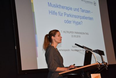 „Musiktherapie und Tanzen – Hilfe für Parkinson-Patienten oder Hype?“. Nadine Altfeld, Dipl. Musiktherapeutin und neurologische Musiktherapeutin am Herz-Jesu-Krankenhaus Münster-Hiltrup, brachte die Auswirkungen von Musik nahe: Musik bewegt – Motorik, Sprache, Kognition und Emotionen werden positiv beeinflusst. Als Beispiel stellte sie in kurzen Videos u.a. eine Patientin vor, die durch Tanzen in einer Gruppe wieder blockadefrei durch den Saal gehen konnte, was ihr vor dieser Stunde nicht möglich war. Bei einer anderen Patientin wurde das Gehen mit Musikbegleitung deutlich besser. Auch die Beweglichkeit im Allgemeinen und die Feinmotorik sowie die Aufmerksamkeit und die Stimmung verändern sich positiv.