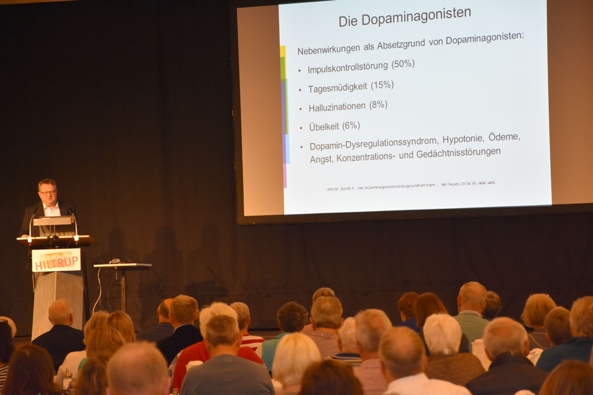 Zum Thema „Impulskontrollstörungen und andere schwerwiegende Nebenwirkungen von Parkinson-Medikamenten“ referierte Dr. med. Michael Ohms, Leitender Oberarzt der Neurologie. Am häufigsten treten Impulskontrollstörungen auf, gefolgt von Tagesmüdigkeit., Halluzinationen, Übelkeit sowie weitere Beschwernisse wie Angst oder Konzentrations- und Gedächtnisstörungen. Dem wirken eine Reduzierung der Dopaminagonisten entgegen bei gleichzeitiger Erhöhung anderer Medikamente. Auch können sich psychische Störungen entwickeln, die Partnerschaften in Gefahr bringen oder gar den Verlust des Arbeitsplatzes zur Folge haben können.