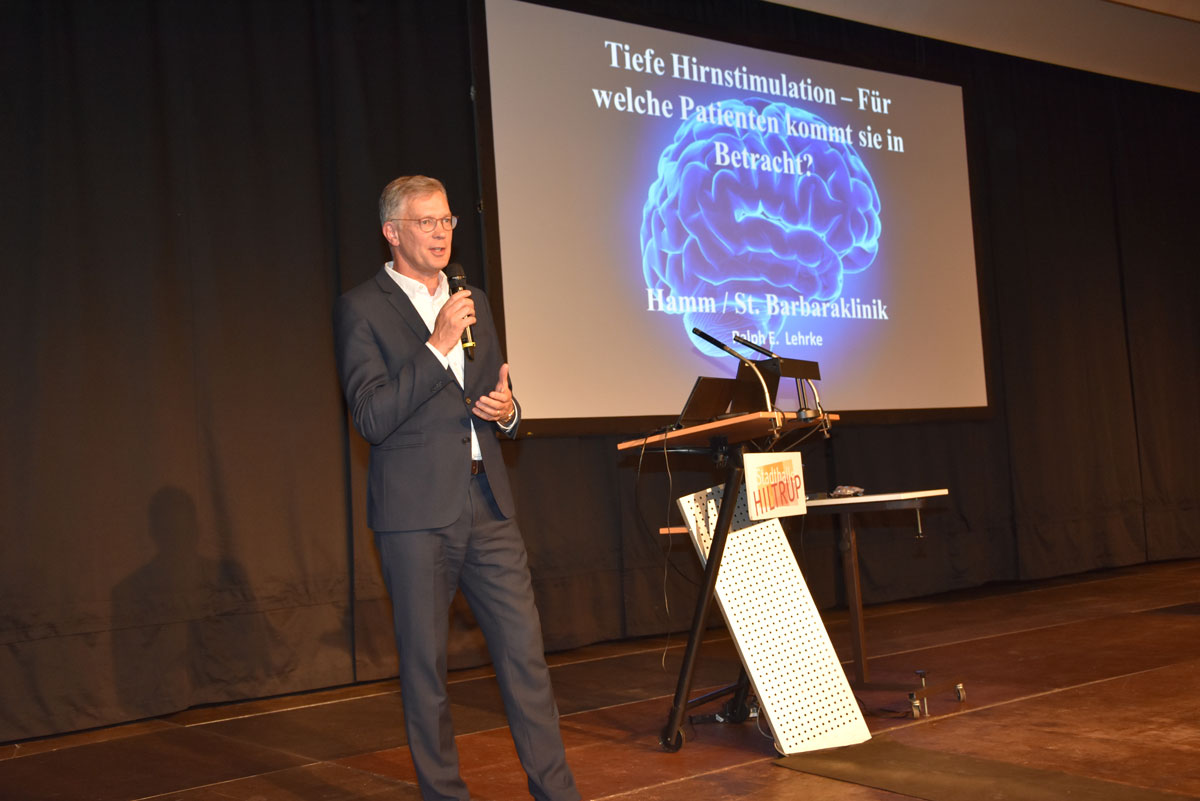 Dr. med. Ralph Lehrke, Chefarzt taktischen Neurochirurgie an der St. Barbara-Klinik Hamm Heesen, erläuterte das Thema „Tiefe Hirnstimulation – Für welche Patienten kommt sie in Betracht?“. Die Patienten sollten seit 4 bis 5 Jahren an Parkinson erkrankt sein wobei es nach „oben“ keine feste Grenze gibt. An erster Stelle ist der Tremor zu nennen.
