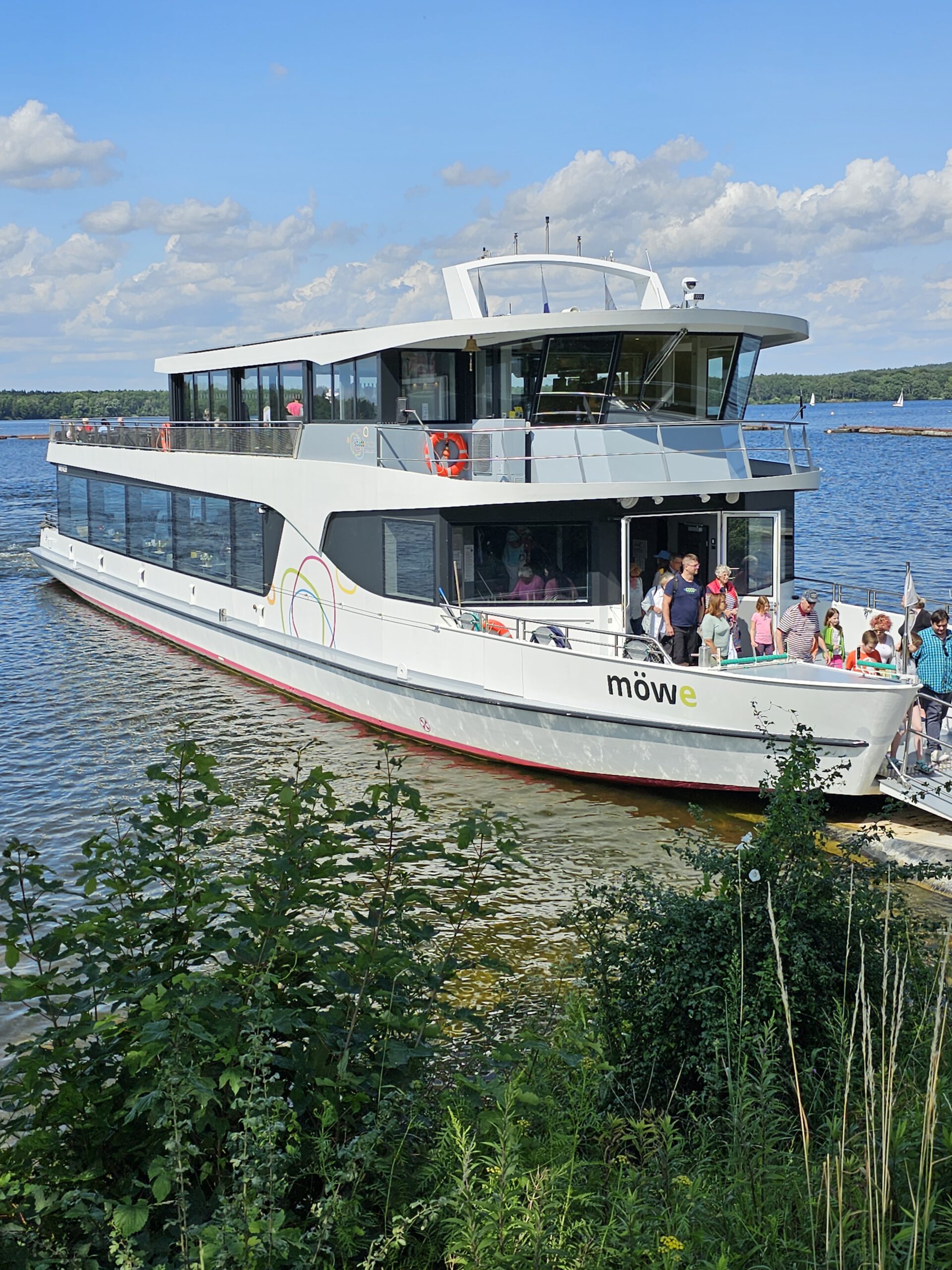 Danach führte der Weg zum nahegelegenen Schiffsanleger, wo das neue Schiff „Möwe“ auf die Gäste wartete. Im Unterdeck waren im Restaurant schon Kaffee und Kuchen eingedeckt. Riesige Panoramafenster machten den Eindruck, im Freien zu sitzen. Lebhafte Gespräche fanden auch hier statt.
