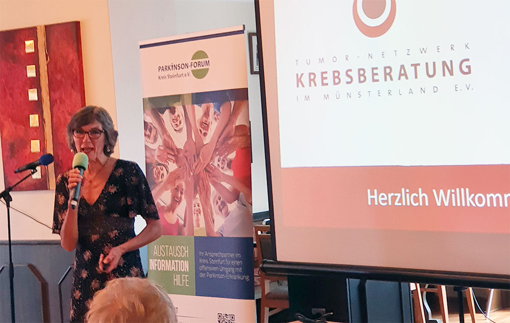 „Das war hochinteressant und hat unsere Konzentration mächtig gefordert“, atmete eine Dame beim Treffen des Parkinson-Forums Kreis Steinfurt e. V. tief durch. Immerhin hatten die über 90 Teilnehmer gerade zwei Vorträge mit jeder Menge Informationen zu verarbeiten. So ging Gudrun Bruns vom Tumor-Netzwerk Krebsberatung im Münsterland e.V. ausführlich auf das Thema „Mit einer Krebserkrankung leben“ ein und erläuterte, wie eine kompetente Beratung Patienten und deren Angehörige in allen Phasen der Krankheit dabei unterstützen kann. Wie sich die Lebensqualität der Betroffenen erhöhen lässt, zeigte Bruns unter anderem auf. „Übrigens ist der Fernsehdetektiv Leonard Lansink alias Wilsberg Schirmherr unseres Netzwerkes“, überraschte sie schließlich ihre Zuhörer.